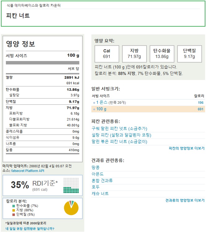 식품 데이타베이스와 칼로리 카운터 영양 정보 서빙 사이즈 100 g 열량 2891 kJ 691 kcal 탄수화물 13.86g 설탕당 3.97g 단백질 9.17g 지방 71.97g 포화지방 6.18g 다불포화지방 21.614g 불포화 지방 40.801g 콜