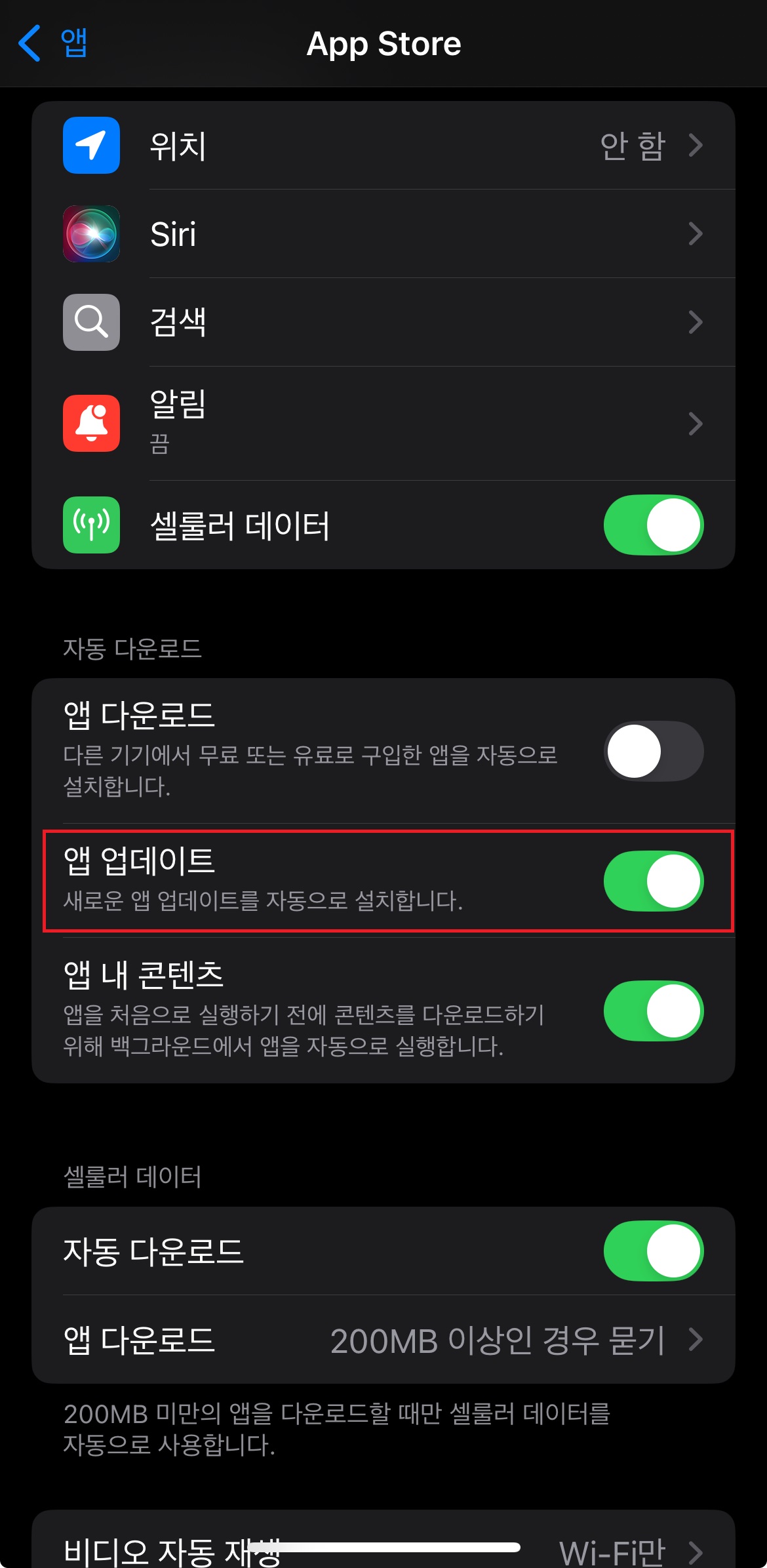 ✅ 자동 다운로드 및 앱 업데이트 제한