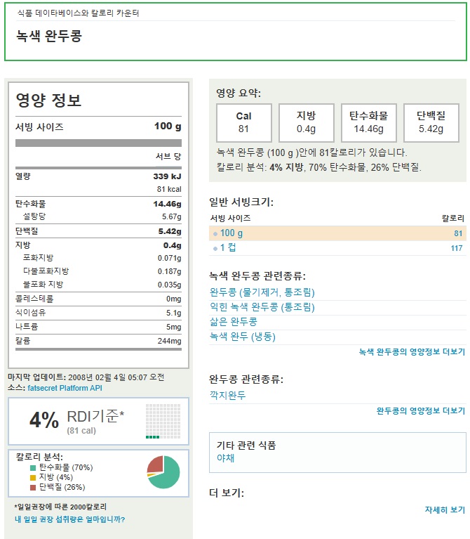 식품 데이타베이스와 칼로리 카운터 영양 정보 서빙 사이즈 100 g 열량 339 kJ 81 kcal 탄수화물 14.46g 설탕당 5.67g 단백질 5.42g 지방 0.4g 포화지방 0.071g 다불포화지방 0.187g 불포화 지방 0.035g 콜레