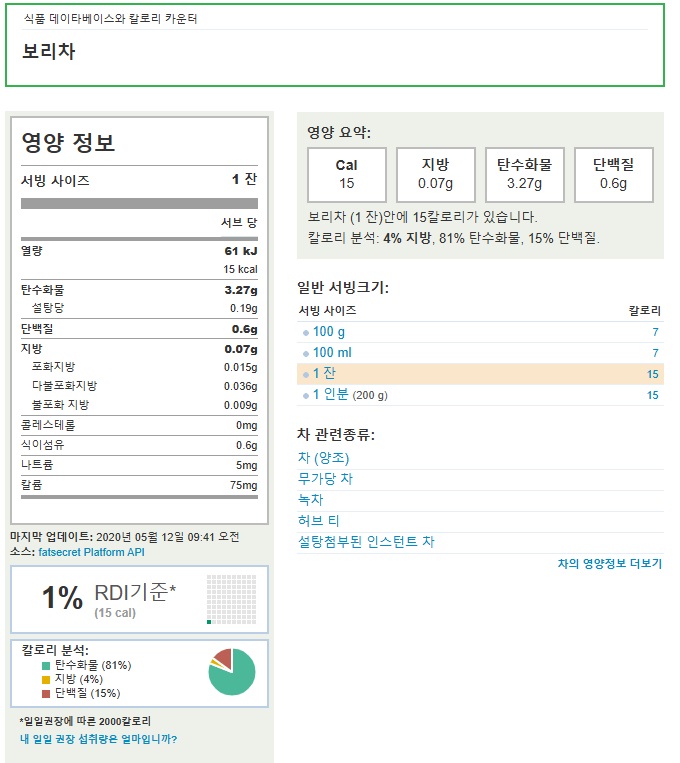 식품 데이타베이스와 칼로리 카운터 영양 정보 서빙 사이즈 1 잔 열량 61 kJ 15 kcal 탄수화물 3.27g 설탕당 0.19g 단백질 0.6g 지방 0.07g 포화지방 0.015g 다불포화지방 0.036g 불포화 지방 0.009g 콜레스