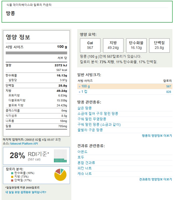식품 데이타베이스와 칼로리 카운터 영양 정보 서빙 사이즈 100 g 열량 2372 kJ 567 kcal 탄수화물 16.13g 설탕당 3.97g 단백질 25.8g 지방 49.24g 포화지방 6.834g 다불포화지방 15.559g 불포화 지방 24.429g