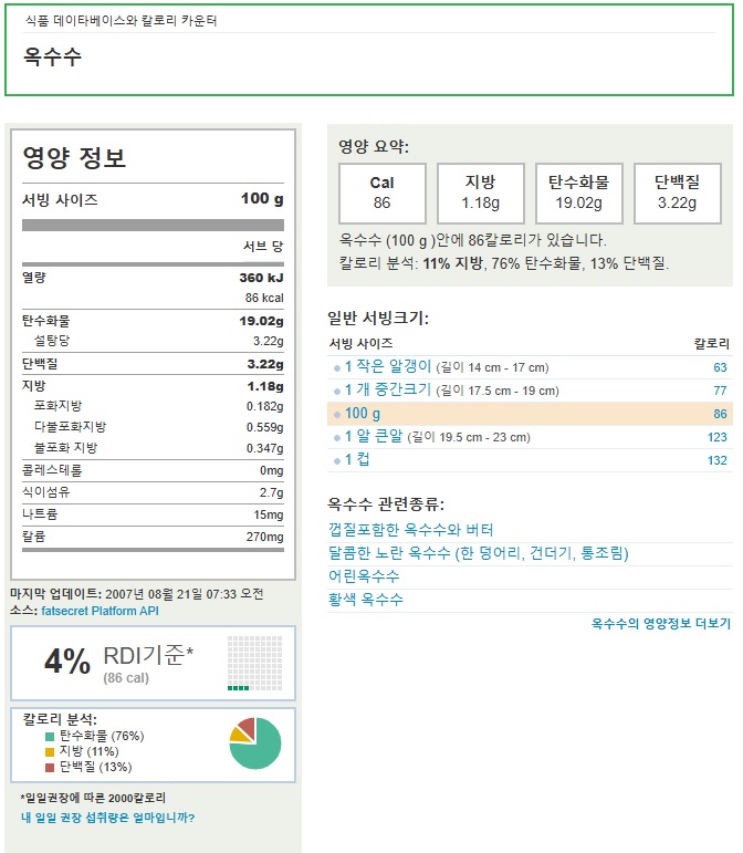 ✅ 팁: 통옥수수보다는 가공된 옥수수(옥수수 시리얼, 콘스프, 통조림 등)는 당분과 나트륨 함량이