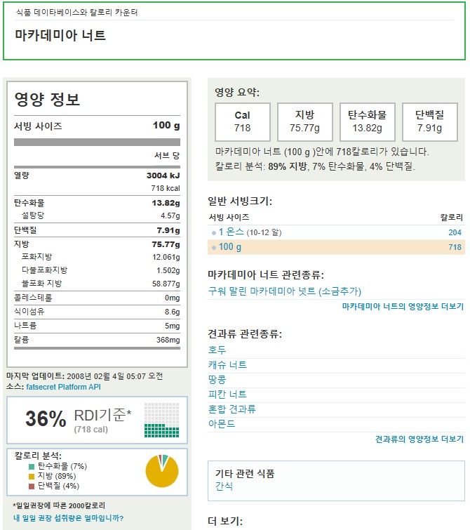 식품 데이타베이스와 칼로리 카운터 영양 정보 서빙 사이즈 100 g 열량 3004 kJ 718 kcal 탄수화물 13.82g 설탕당 4.57g 단백질 7.91g 지방 75.77g 포화지방 12.061g 다불포화지방 1.502g 불포화 지방 58.877g