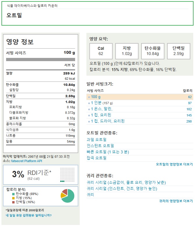 식품 데이타베이스와 칼로리 카운터 영양 정보 서빙 사이즈 100 g 열량 259 kJ 62 kcal 탄수화물 10.84g 설탕당 0.24g 단백질 2.59g 지방 1.02g 포화지방 0.18g 다불포화지방 0.372g 불포화 지방 0.32g 콜레스