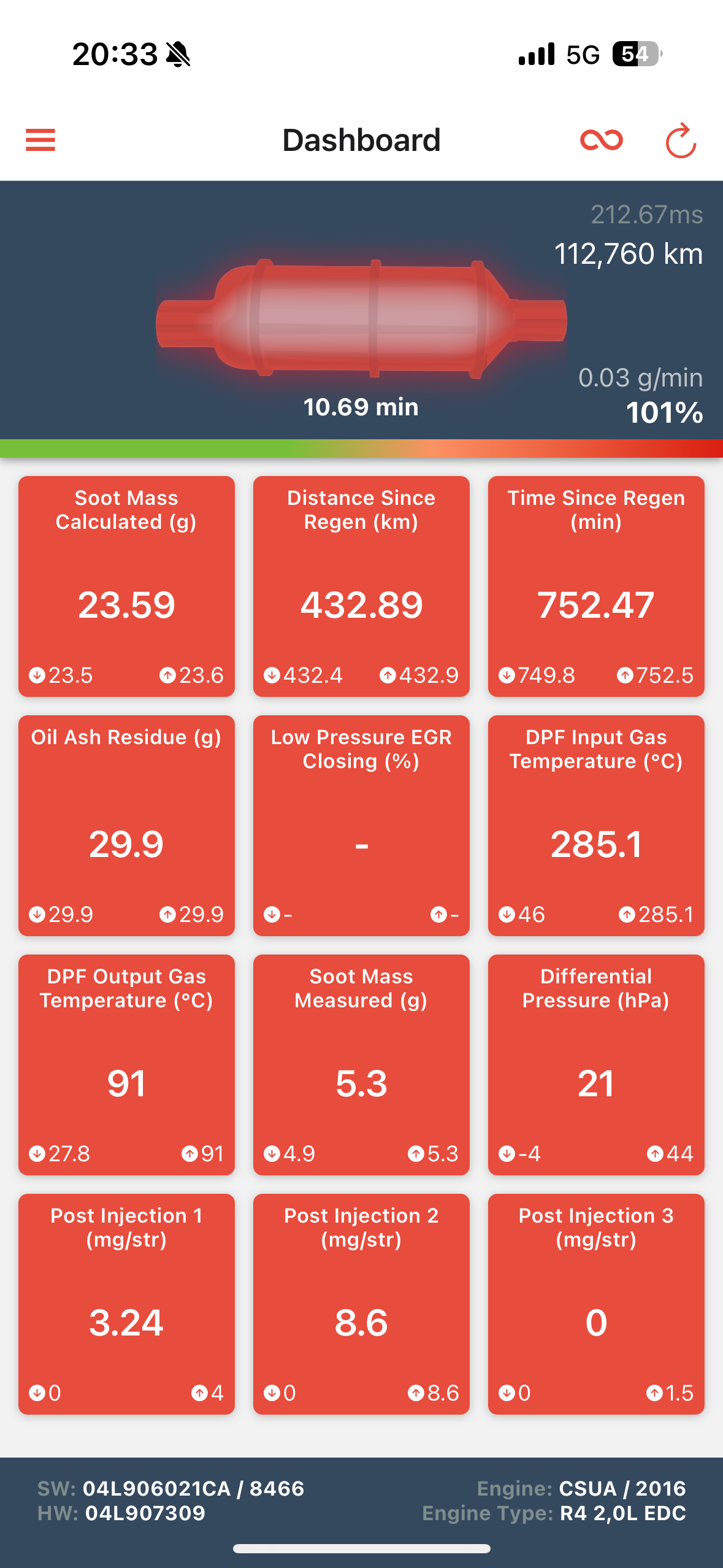 게이지가 100%가 되면 고속주행시 빨갛게 변하면서 DPF를 태우기 시작합니다.