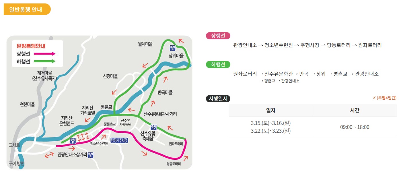 - 제1 주차장: 구례군 산동면 산수유문화관 주차장