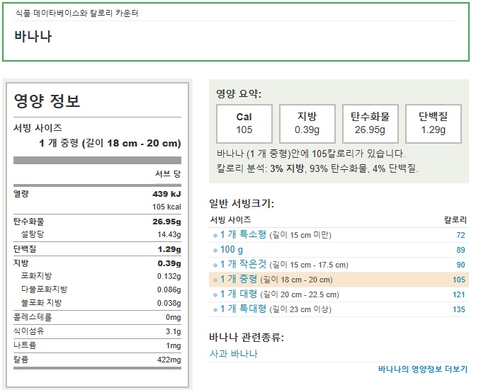 식품 데이타베이스와 칼로리 카운터 영양 정보 서빙 사이즈 1 개 중형 (길이 18 cm - 20 cm) 열량 439 kJ 105 kcal 탄수화물 26.95g 설탕당 14.43g 단백질 1.29g 지방 0.39g 포화지방 0.132g 다불포화지방 0.086g