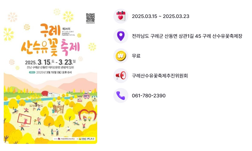 | 2025 구례 산수유꽃축제 총정리 – 일정, 가는 길, 맛집, 포토존 완벽 가이드! (5) | 2025.02.28 |
