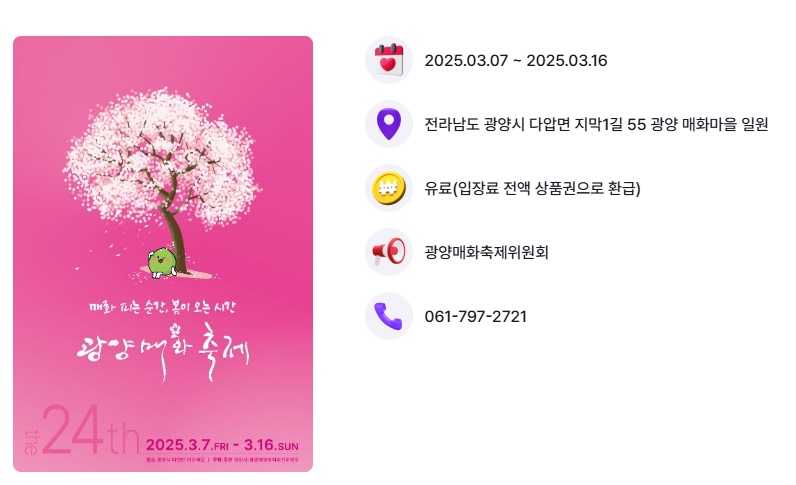 2025 광양 매화축제 완벽 가이드 🌸 – 일정, 주차, 맛집, 포토스팟 총정리 입니다! 봄의 시작을 알리는 대표적인 꽃축제, 2025 광양 매화축제가 돌아왔습니다! 💕 섬진강 변을 따라 흐드러지게