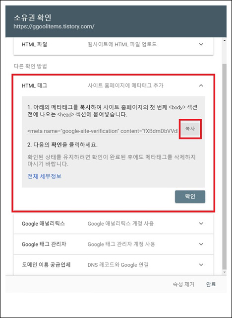 · 도메인(Property) 방식: tistory.com 전체를 등록 가능 (DNS 인증 필요)