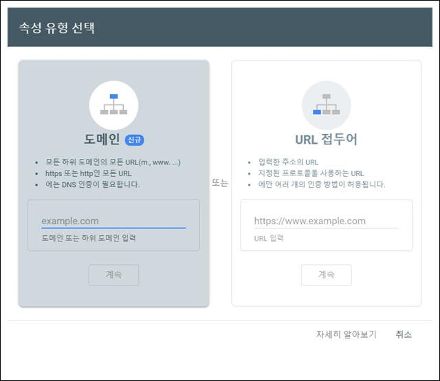 구글 서치 콘솔에는 두 가지 방식으로 사이트를 등록할 수 있습니다.