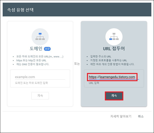 본인의 티스토리 URL을 그대로 입력하시고 계속을 눌러주세요!