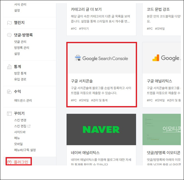 1. 블로그 관리자페이지 → 플러그인 → 구글서치콘설 등록