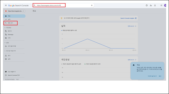 4. 몇 분 후 "색인 생성 요청됨" 메시지가 뜨면 완료