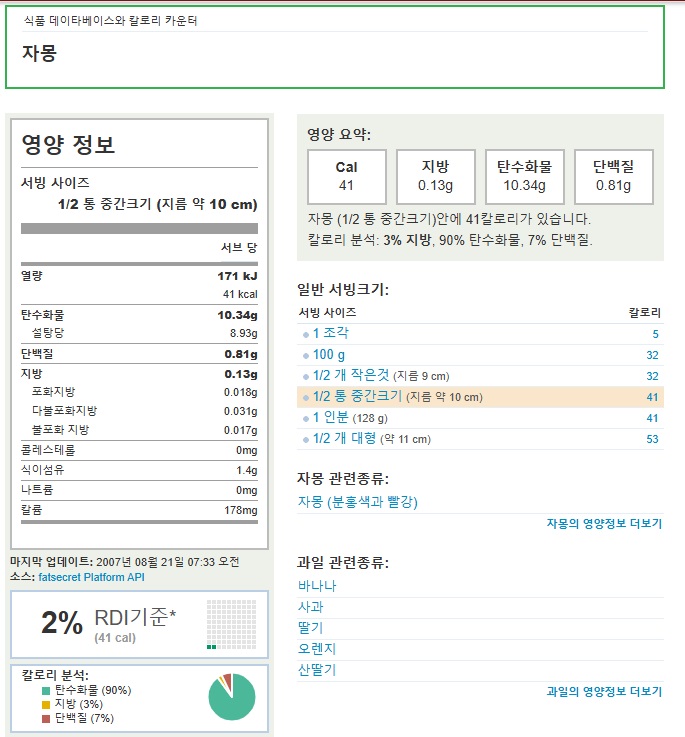 식품 데이타베이스와 칼로리 카운터 영양 정보 서빙 사이즈 1/2 통 중간크기 (지름 약 10 cm) 열량 171 kJ 41 kcal 탄수화물 10.34g 설탕당 8.93g 단백질 0.81g 지방 0.13g 포화지방 0.018g 다불포화지방 0.03