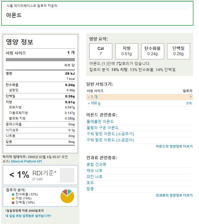 - 하루 23알(약 28g, 160kcal) 섭취가 권장됩니다.