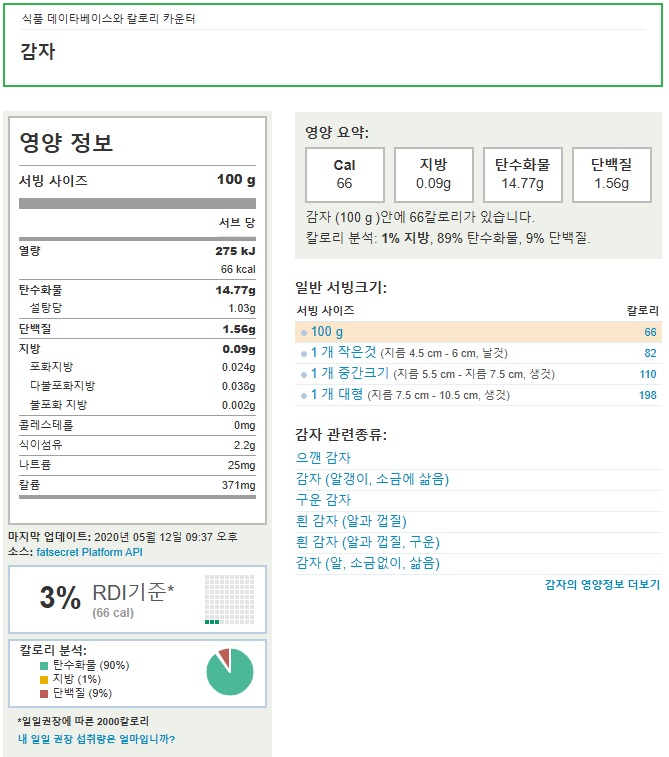 식품 데이타베이스와 칼로리 카운터 영양 정보 서빙 사이즈 100 g 열량 275 kJ 66 kcal 탄수화물 14.77g 설탕당 1.03g 단백질 1.56g 지방 0.09g 포화지방 0.024g 다불포화지방 0.038g 불포화 지방 0.002g 콜레