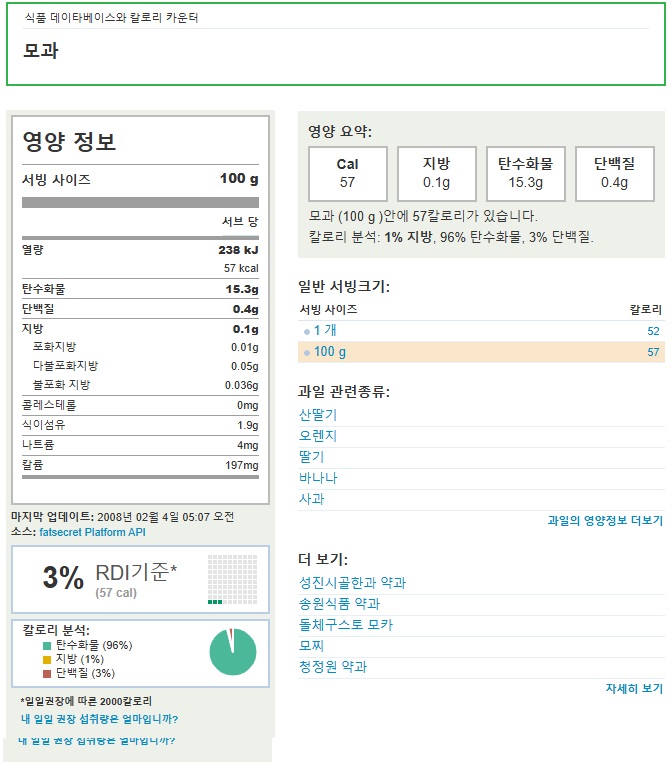 식품 데이타베이스와 칼로리 카운터 영양 정보 서빙 사이즈 100 g 열량 238 kJ 57 kcal 탄수화물 15.3g 단백질 0.4g 지방 0.1g 포화지방 0.01g 다불포화지방 0.05g 불포화 지방 0.036g 콜레스테롤 0mg 식이