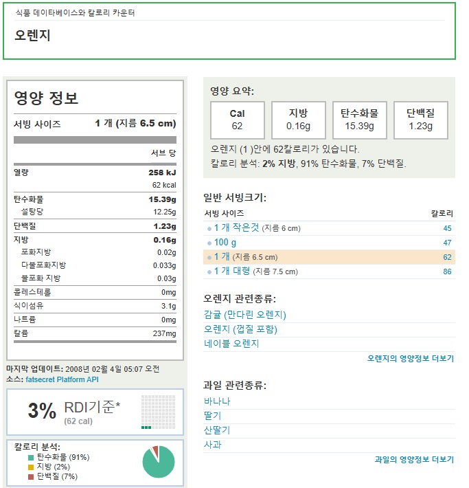 식품 데이타베이스와 칼로리 카운터 영양 정보 서빙 사이즈 1 개 (지름 6.5 cm) 열량 258 kJ 62 kcal 탄수화물 15.39g 설탕당 12.25g 단백질 1.23g 지방 0.16g 포화지방 0.02g 다불포화지방 0.033g 불포화 지
